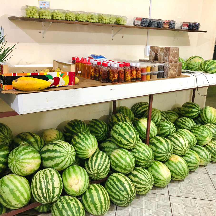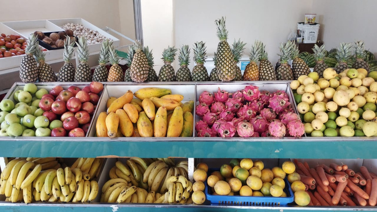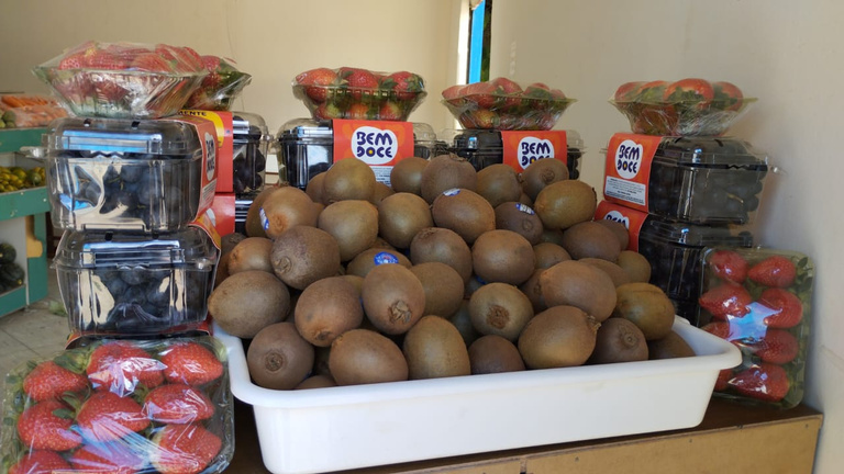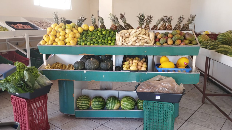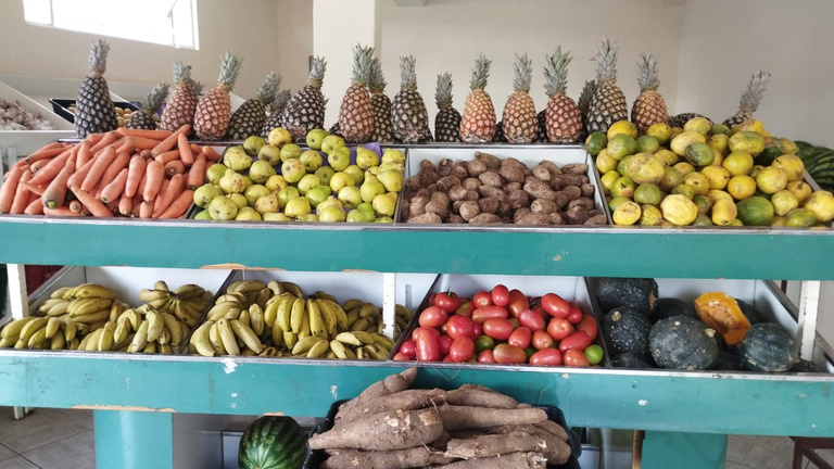 Temos bananas, tomate, pamonhas, andu verde, ovos caipira, verduras cortadas, roscas, doces, diversos tipos de frutas, legumes e verduras.